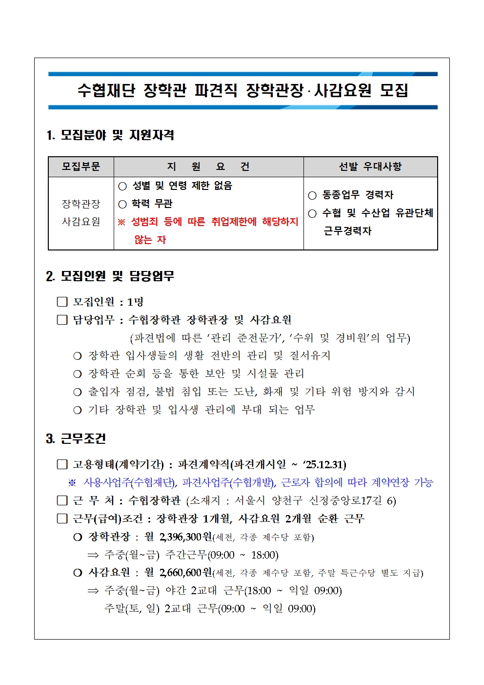 수협재단 장학관(파견직) 장학관장, 사감요원 모집